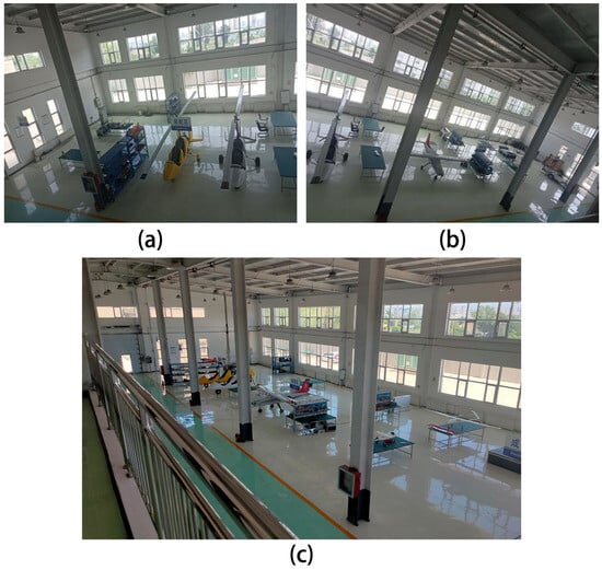 Photo of an aircraft manufacturing workshop: (a) left half part; (b) right half part and (c) entire workshop.