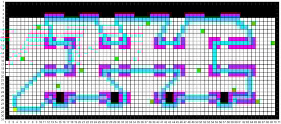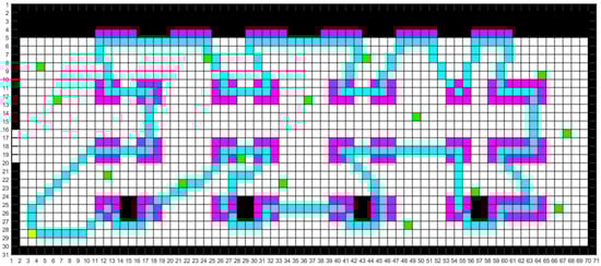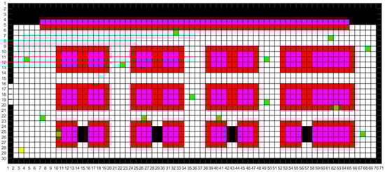 We modeled the map according to the real environment of the aircraft manufacturing workshop. Common maps include raster, topological and semantic maps. The raster map is simple in its data structure and can effectively express the variability of the space. And the two-dimensional raster map modelling method was used in this study to simulate the real UAV inspection environment in the workshop [], as shown in Figure 3.