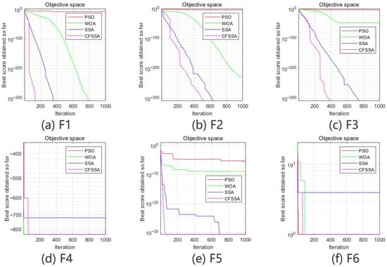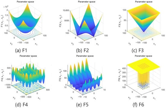 To verify the optimization performance of the CFSSA, several different reference functions were selected for testing. There are 23 commonly used reference functions, and six representative ones were selected in this study [,,]. The function parameters are shown in Table 1.