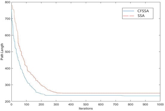Figure 7 and Figure 8 show the optimal inspection paths with the SSA and CFSSA, respectively. The cyan part indicates the planned path. Figure 9 shows the comparison of the iteration effect before and after the CFSSA’s improvement. As shown, the CFSSA could iterate to the global optimal solution faster than the SSA, while the SSA was more likely to fall into local optima.