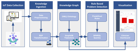 This section presents the proposed semantic framework for monitoring ADLs in a smart home environment with the aim of detecting problems related to their performance. An overview of the architecture of this framework is shown in Figure 1. The first stage of the pipeline is the IoT data collection from sensors in a smart home setting to monitor ADLs. The next stage includes the pre-processing of the raw data and their conversion to RDF triples. The combination of RDF data and the implemented ontology that defines their structure constitute the knowledge graph. Afterward, predefined rules in SPARQL format are applied to the knowledge graph, aiming to detect problems in ADLs execution. Finally, the visualization of the results in a clinician dashboard concludes this procedure.