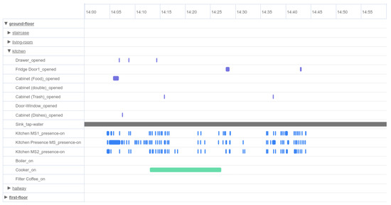 Following the same procedure, we can create some larger clusters that consist of correlated events corresponding to the room of the smart home and the time series that occurred. For instance, grouping events that occurred in the kitchen, such as motion detection in space, opening and closing of drawers and operation of the electric cooker in a specific period of time, composes a sequence of events for a hot meal preparation activity. This activity is depicted in Figure 3 with the horizontal light blue line. Below that line, some of the previously mentioned events that reveal the cooking activity are included. Similarly, we can identify all different ADLs that patients were instructed to perform based on the protocol during their accommodation in the smart home.