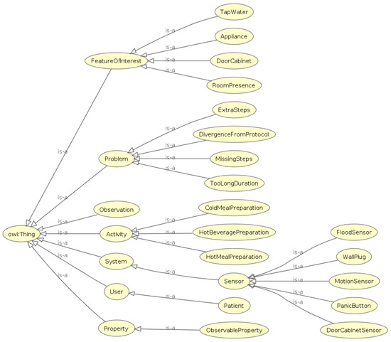 Figure 4 shows the OWL classes constituting the “ADL Recognition Ontology”. This ontology is an adapted and extended version of the semantic sensor network (SSN) ontology and the sensor, observation, sample, and actuator (SOSA) ontology [43]. The combination of these two well-established ontologies is intended to provide a comprehensive framework for describing sensors and their corresponding observations. This combined ontology has been used as a fundamental core in other applications [44]. The utilization of these well-established representation models ensures the interoperability of our framework. One of our primary goals was to develop an extensible ontology in order to ensure the flexibility of supporting more scenarios in the future by adding further subclasses to each class category. For instance, the “Sensor” class can represent any other sensor that may be used in a smart home environment. Likewise, this ontology could be enriched with additional “Activity” subclasses depending on the cases being studied. Furthermore, the structure of the “Problem” class gives us the opportunity to add more problem types that may have occurred during the execution of an activity. In our ontology, the “Problem” class has four subclasses, each modeling a specific problem that may be observed by assessing an Activity execution. As mentioned in previous sections, these problem types are related to deviations from the protocol that smart home participants were instructed to follow. After consulting clinicians, we ended up modeling four problem types with the corresponding “Problem” subclasses. These problem types are divergence from the protocol of an ADL, observation of extra or missing steps in each ADL protocol and excessively long duration of an Activity until it is completed.