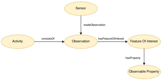 Generally, the “Observation” class represents an event that was monitored by a “Sensor” instance. Consequently, the “Activity” class represents an activity that was synthesized by one or more “Observation” instances. Each “Observation” is linked to a specific “FeatureOfInterest” that describes what is being observed or measured by a sensor. In the “ADL Recognition Ontology”, this class is extended with four subclasses that specify the type of sensor that generated each observation. The “ObservableProperty” class is associated with “Observation” class and represents the attributes captured by a sensor. For example, in the case of a sensor capturing a presence in a room, the timestamp and the switch from 0 to 1 value are the attributes of this observation. Figure 5 represents the relations between the “Observation” and the “Activity” class in the ADL Recognition Ontology. The classes “Sensor”, “Observation”, “FeatureOfInterest” and “ObservableProperty”, along with their associated relationships are important components of the SSN/SOSA ontologies. These classes have been expanded with numerous subclasses and linked to new classes to fulfill the representation requirements of our study.