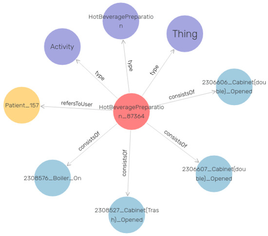 Figure 6 visualizes an example of the RDF data in our knowledge graph. In this example, the central red node is an instance of the “Activity” class as it is described in the purple node. The four edges with the label “consists of” end up in the four different instances of the “Observation” class that constitute the main Activity. In order to better comprehend this graph instance, we can consider the red node as a “Hot Beverage Preparation” activity. The “Observation” objects represent the events that occurred during this activity execution. In this case, these events are the opening of specific kitchen drawers and cabinets, as well as turning on the coffee machine. Last but not least, the yellow node represents the patient that performed this activity. The graph pattern presented in Figure 6 is just one instance of the thousands that are linked together to construct the entire knowledge graph.