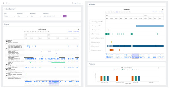 The data visualization dashboard, presented in Figure 7, is a significant element of our framework, providing clinicians with an intuitive and comprehensive overview of the monitored activities and detected problems. This dashboard consists of three main sections: the data filter section, empowering users to apply filters such as participant selection, date range, and resolution; the events and activities section, presenting a detailed log of activities monitored by smart home sensors for each participant; and the problem plot, visually representing the detected problems over time. These components offer clinicians a valuable tool to efficiently analyze and interpret the data collected by our semantic framework.