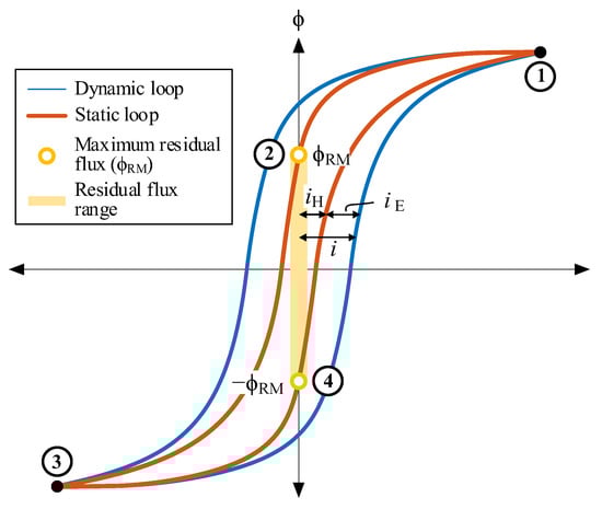 Static hysteresis is responsible for the residual flux. Since classical eddy losses and excess losses have no impact on residual flux, both elements are collectively categorized as eddy losses in this study. Consequently, the no-load current, denoted as i, is the sum of the current attributed to hysteresis losses (iH) and the current arising from eddy losses (iE), as illustrated in Figure 3. This yields two distinct loops: