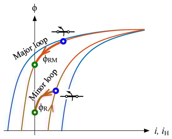 When the switch aperture initiates between points 1 and 3 on Figure 3, for example, at the upper blue circle in Figure 4, the flux trajectory commences along the major loop. This trajectory continues until the residual flux consistently attains the maximum possible residual flux, denoted as ϕRM. Conversely, if the aperture initiates at the lower blue circle, marked at a distinct de-energization point-on-wave, the flux follows an asymmetric minor loop trajectory. This trajectory persists until the residual flux reaches ϕR, a value smaller than ϕRM.