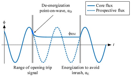 This equation shows the influence of both the energization point-on-wave, denoted as αE, and the residual flux, denoted as ϕR, on the flux during energization. To prevent subsequent inrush current, the offset in Equation (3) must be null. Consequently, if ϕR equals ϕRM, the optimal αE is determined by the following: