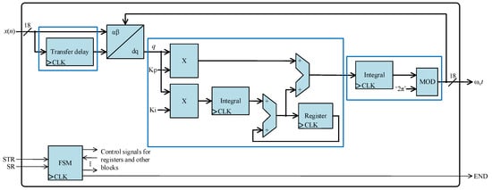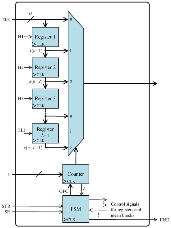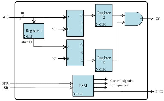 Figure 13 depicts the architecture of the transfer delay block. This block also has the STR and SR input signals and the END output signals, similar to the zero-crossing detection core. L−1 parallel registers are connected in cascades to store the L−1 most recent input samples, where L is equal to T/4. The initial outputs of all registers are equal to zero. The input x(n) and the registers’ outputs are connected through a multiplexor to the output. With the help of the multiplexor and a counter, the flow of present and past input samples can be controlled by the FSM.