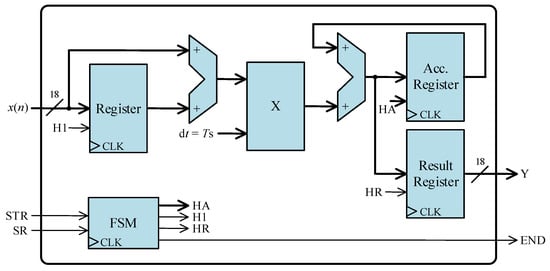 The processing core employs a parallel register (Register 1) to store the preceding input sample, x(n − 1). Upon the availability of a new sample at the input x(n), the register is enabled, facilitating the storage of the latest sample while discarding the penultimate one. Additionally, two registers are employed to regulate the output result flow. The core incorporates a finite state machine (FSM) to govern the activation of registers and, consequently, the data flow. This FSM also manages the indicator signals (STR, SR, and END).