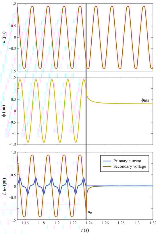 The smart switching system requires only two sets of data: ϕRM and ϕ0, or their corresponding voltage points-on-wave αRM and α0, coupled with an understanding of the utilized switching technology. As explained before, these data sets can be acquired through preliminary transformer no-load tests or by monitoring the primary current and secondary voltage of the transformer during the initial de-energization. All the signal waveforms acquired during the smart switching are depicted in Figure 15, while in Figure 16, they are depicted with more detail only during the de-energization.