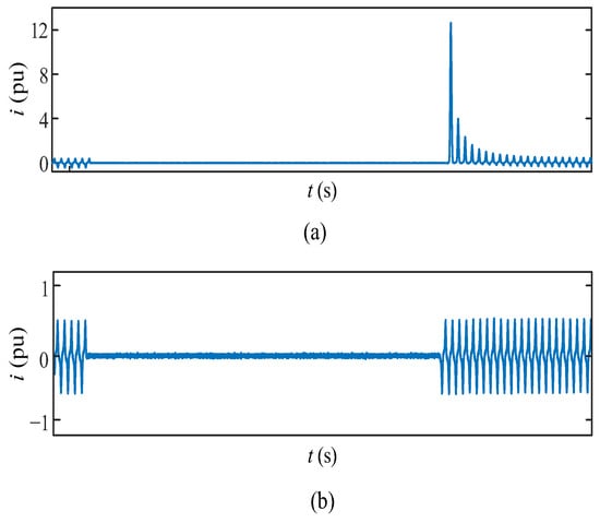 (a) Experimental inrush current resulting from random switching; (b) experimental current resulting with smart switching.
