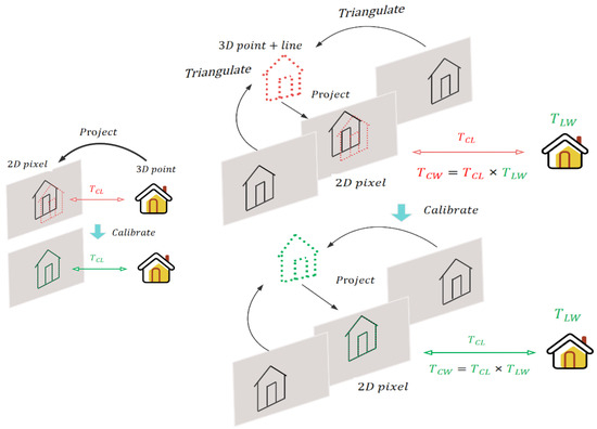 In the process demonstrated in Figure 2, we input to triangulate point and line features on an image plane. After this, the system adjusts the positions of these features and external parameters by differentiating the reprojection error. The aim is to minimize the overall reprojection error and obtain calibrated external parameters.