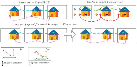 Both feature point methods are used for extraction and matching, with the most suitable method dynamically selected. In the fast method, features are uniformly positioned throughout the image, similar to object detection using VDO-SLAM [45]. This ensures that feature information is available even in environments with less distinct textures. We use optical flow for inter-frame feature tracking. If the number of inlier tracks falls below a certain level (which is set at 1200 by default), new features are detected and added to the map. The feature point method extracts up to 1200 SuperPoint [46] feature points per frame and uses the SuperGLUE [47] model for matching. The AG3line method is used to extract line features, as explained in [27], while prediction and fusion are achieved using the optical flow method proposed in [37]. The entire process is illustrated in Figure 3. It is important to note that this process uses only existing deep learning models and methods, and does not require additional data for model training.