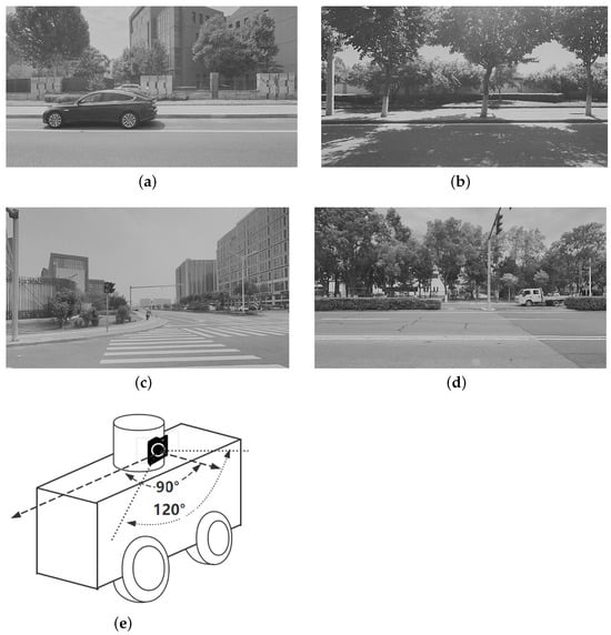 We captured six sets of urban street scenes using monocular side-facing cameras mounted on autonomous delivery vehicles, as shown in Figure 4e. These datasets show different textures, lighting, and distance, which can be seen in Figure 4. Two datasets were well-lit with rich textures (Figure 4a,c), while two others were shaded by trees with weak textures (Figure 4b,d). The remaining two had mixed lighting and textures. Autonomous vehicles encounter varying lighting and shadow conditions in some frames of their datasets, while other frames show consistent scene characteristics.