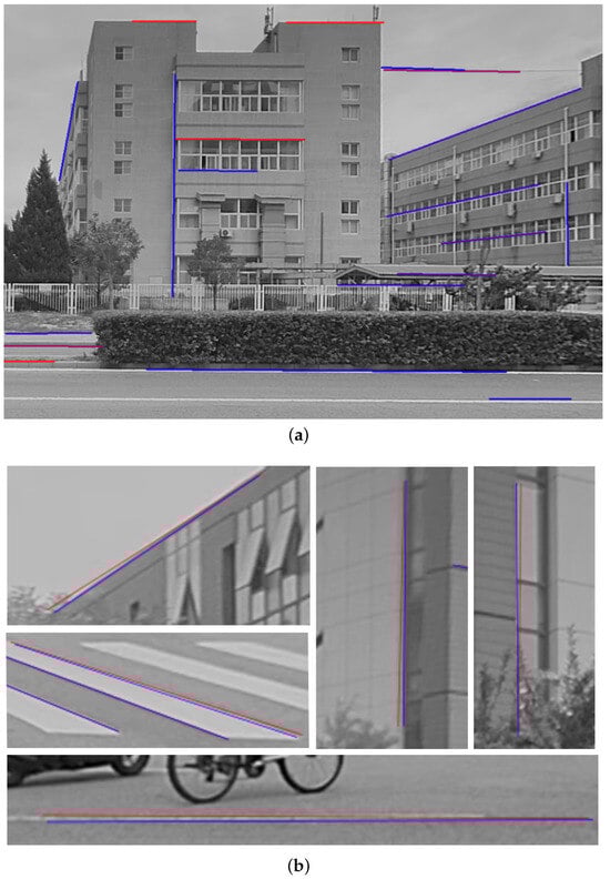 After fine-tuning, we were able to achieve highly accurate line features. In Figure 5, the red line segments represent the edge segments that were initially imprecise. On the other hand, the blue line segments depict the optimized and accurate ones, which helped reduce errors caused by inaccurate feature extraction.