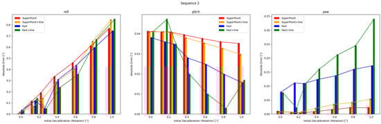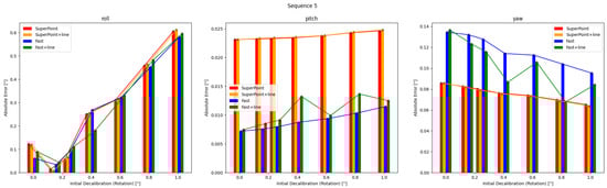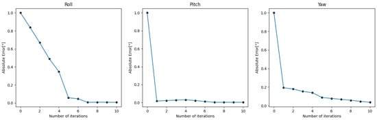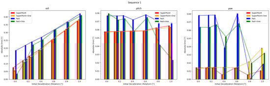 The results of single optimizations for three sequences with varying initial perturbations are displayed in Figure 6, Figure 7 and Figure 8. The details are in Table A1, Table A2, Table A3, Table A4, Table A5 and Table A6. It can be seen that the roll correction exhibits more significant deviations as compared to the pitch and yaw directions. However, the latter are usually corrected within an error range of 0.15°. The pitch error is always less than 0.1°.