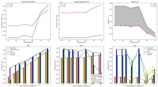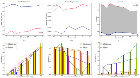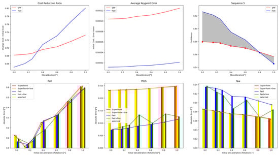 Different methods for correcting roll, pitch, and yaw may have varying effects, requiring a trade-off. Typically, the roll direction with the highest deviation is prioritized. Figure 9, Figure 10, Figure 11 and Figure 12 demonstrate the selection methods for the four aforementioned sequences. The rest are in Figure A1 and Figure A2. As the initial perturbations increase, the ratio of cost reduction in the pre-optimization process and the average error of feature points both increase, leading to a reduction in the confidence level determined by our criteria. We use the cost reduction ratio and the average error of the feature points in pre-optimization to decide whether to include line features in the iterative optimization process. A positive hexagonal marker on the confidence curve shows that the point feature optimization method has been selected.
