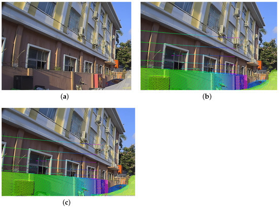 The function is used to project a 3D point X from the world coordinate system onto a 2D image plane. The external parameters to be optimized are represented by . We use the result of the previous optimization as the initial value for the external parameters and then continuously iterate until the number of iterations reaches the threshold. We use weighted values, represented by , to adjust the influence of line feature length and track count. By doing so, the line features’ residual error is reduced. We give greater importance to line features that are almost perpendicular to the horizontal plane, as they provide more precise triangulation. We sorted vertical and horizontal lines based on their angles relative to the horizontal plane post-triangulation. We included them in the optimization in the following proportion: frames–vertical–horizontal = 600:90:10.