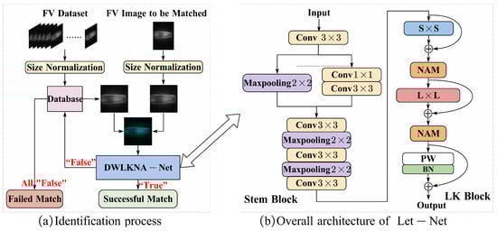 In practical applications, the identification process of Let-Net is shown in Figure 1a, which mainly includes image input, image preprocessing, FV feature extraction, model prediction, and result matching. Initially, a representative sample image for each finger type is randomly selected from existing databases and incorporated into the new FV database, ensuring the inclusion of at least one sample image for each finger type. Subsequently, Let-Net receives the image to be detected and a specific type of image from the database. The model then generates a matching result, indicating the concordance or disparity between the two images. A “True” match signifies that the image to be detected and the selected database image originate from the same finger. Conversely, in the case of a “False” match, the next type of image is selected for further matching, iteratively continuing until the matching process is completed. If, after traversing the entire database, no matching image is found, it implies that the image to be detected fails to correspond to any type of image in the database. Through this approach, Let-Net efficiently leverages the image information within the database, progressively determining the category to which the detected image belongs, thereby accomplishing the FV identification task. In comparison to conventional classification models, Let-Net exhibits significant superiority in terms of scalability. When confronted with new finger samples not present in the training set, there is no need to retrain the model; rather, the integration of the vein feature data of these new fingers into the database enables successful and precise classification recognition for the respective fingers. In contrast, classification models typically undergo the process of data updating from the training set and model retraining when handling such new samples.