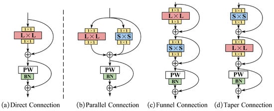 Structural design of large kernel: (a) Direct Connection; (b) Funnel Connection; (c) Funnel Connection; (d) Taper Connection.