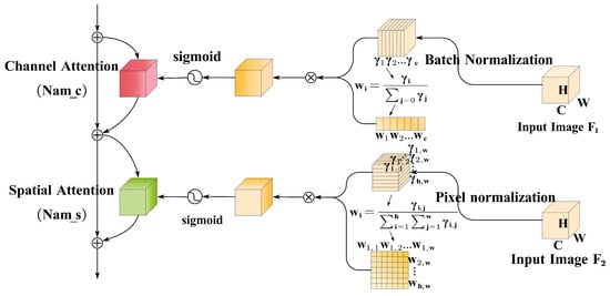 In Equation (6), the variables and denote the input and output of the BN, respectively, while and represent the scale and displacement. Additionally, and signify the mean and standard deviation of the input data. In Equation (7), i represents the dimension, denotes the scaling factor of the dimension, L indicates the total length of the dimension, and represents the weight associated with the channel corresponding to dimension i. The application of the scaling factor from BN to the spatial dimension results in the derivation of the corresponding weight , as illustrated in Equation (8). Typically, the dimensions calculated by BN align with channel dimensions. By determining the proportion of the scaling factor for each channel and multiplying it with the original features, the weight for each channel is computed, facilitating the redistribution of channel information. Ultimately, the channel attention is acquired by activating the sigmoid function, followed by dimension transformation to map the dimensions calculated by BN to spatial pixels. The channel attention mechanism based on normalization (NAM_c) and the spatial attention mechanism (NAM_s) are visually depicted in Figure 3.