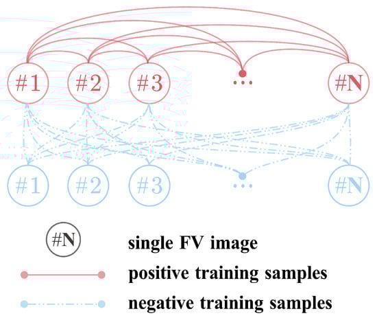In this study, a dual-channel network is utilized, wherein each input consists of a pair of images, thereby yielding two images per pair. As illustrated in Figure 4, positive samples are constituted by pairing two images belonging to the same category, while negative samples are formed by combining images from different categories. Using the SDUMLA dataset as an example, a total of 19,080 positive samples and 14,538,960 negative samples can be generated. Given the substantial disparity in the number of negative and positive samples, a random undersampling is applied to the negative samples, reducing them to 19,080. The same procedure is followed for generating image pairs from eight additional datasets.