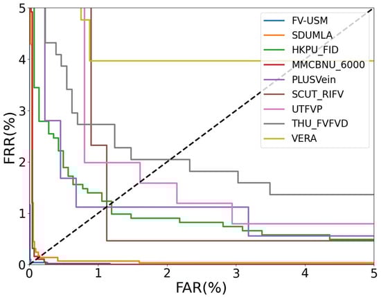 The primary metric employed in the experimentation is the equal error rate (EER), a pivotal measure in biometric systems. EER is determined when the false acceptance rate (FAR) equals the false rejection rate (FRR). Falsely accepted pairs arise when two FV images, belonging to different categories, are erroneously identified as being in the same category. FAR quantifies the percentage of falsely accepted pairs relative to all inter-class pairs, essentially representing the proportion of “unmatched FV images treated as matching FV images”. Conversely, falsely rejected pairs occur when two FV images from the same class are erroneously identified as belonging to different classes. FRR is the percentage of falsely rejected pairs among all within-class pairs, signifying the instances where “FV images that should be matched are not considered matched FV images”. The computations for FAR and FRR are articulated in Equations (9) and (10), respectively.