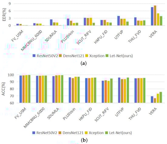 This section employs two evaluation metrics, EER and ACC, to conduct verification experiments across nine publicly accessible FV datasets. The results are comprehensively presented in Table 3. Figure 6a,b illustrate the performance comparison between Let-Net and classical models in terms of EER and ACC, respectively, through bar charts. To establish an intuitive and comparable benchmark, a selection of other deep convolutional network models with analogous network structures is chosen for comparison, including the well-established ResNet50V2, DensNet121, and Xception. The rationale behind choosing these models for comparison lies in their proximity to Let-Net in terms of parameter count and computational cost. Experimental findings reveal that Let-Net consistently outperforms other models in terms of ACC and EER across multiple datasets. Notably, on the MMCBNU_6000 and SCUT_RIFV datasets, Let-Net achieves an EER of only 0.12% and 1.12%, respectively, markedly lower than its counterparts, signifying its robust capability in minimizing EER. Particularly noteworthy are the ACC scores on the SDUMLA and FV_USM datasets, where Let-Net attains ACC values of 99.5% and 99.77%, respectively—remarkable improvements in comparison to other models.