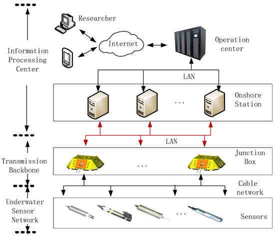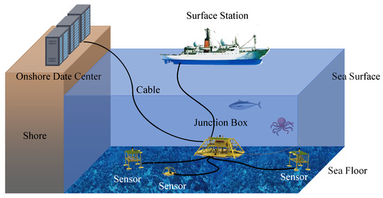 As shown in Figure 3, a SON consists of both surface components (i.e., onshore data centers, surface stations) and underwater components (i.e., junction boxes and sensors). It enables long-term, large-scale monitoring of deep-sea regions. Specifically, the surface components supply power to the underwater components via optical cables and analyze the collected data. For safety purposes, the control unit at an onshore data center processes the data and automatically cuts off power when the warning system detects abnormal values. At the same time, the junction box in the underwater components converts high voltage to medium voltage, providing power to the underwater sensors and transmitting the collected information to the land station [10]. Common underwater sensors include acoustic Doppler current profilers (ADCP), hydrophones, conductivity–temperature–depth (CTD) sensors, and ocean-bottom seismographs (OBS). Numerous underwater sensors connect to a junction box in linear, tree-like, or ring-like configurations, forming an underwater sensor network.
