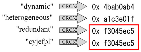 Collision example under CRC check (The CRC checksum values of ‘redundant’ and ‘cyjefpl’ are identical).