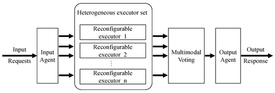 DHR architecture is an endogenous security technique, as depicted in Figure 4. Within this framework, the input agent plays a crucial role in distributing input requests to a diverse set of heterogeneous redundant executors, each responsible for independent processing. Subsequently, the processing results undergo a multimodal voting process, and only the consistently matching results are chosen as the final output. This approach significantly reduces the risk of security weaknesses and vulnerabilities being exploited, thereby ensuring the trustworthiness of the system results. This architecture is widely adopted in the domain of endogenous security. Wei et al. [30] proposed a mimic web application security technology based on the DHR architecture, which makes it difficult for attackers to maintain continuous control and access after a successful attack. Yu et al. [31] successfully applied the DHR architecture to industrial network security, effectively increasing the difficulty of exploiting backdoors, such as paralysis, rule tampering, and information theft. Furthermore, DHR architecture’s adaptability is evident from its successful implementation in various domains, including the Internet of Vehicles [32] and edge networks [33]. These real-world deployments have demonstrated the versatility and effectiveness of DHR architecture in guarding against potential security threats.