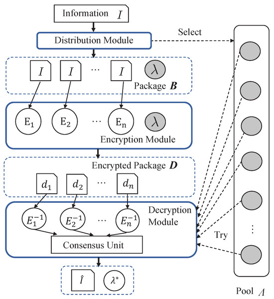 Distribution module takes an input I and generates a package by duplicating I into a set of n identical copies, and selecting a random key from a pool . The resulting package is then forwarded to the encryption unit for further processing.