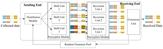 To minimize energy consumption during package encryption in the junction box and ensure cost-effectiveness for practical DHR-based applications [35], we employ a three-degree redundancy approach. Our encryption module comprises three heterogeneous shift units that use distinct shift strategies to transform data packet into corresponding , , and . Specifically, the three shift strategies are as follows: