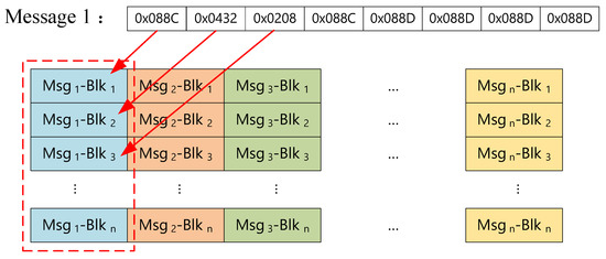 SONs organize sensor data into messages consisting of n blocks of 4-bit hexadecimal numbers. In our framework, these messages are initially transmitted to a DiM, which receives n blocks at a time. The DiM then applies the stacking blocks method [34] to combine messages from m sensors and reorganize them into the stacked packets denoted by . As illustrated in Figure 7, data blocks from the same sensor are listed in the same column. To enhance security, the stacked packets are concurrently dispatched to multiple shift units within EnM, along with the temporary dynamic key selected from a key pool .