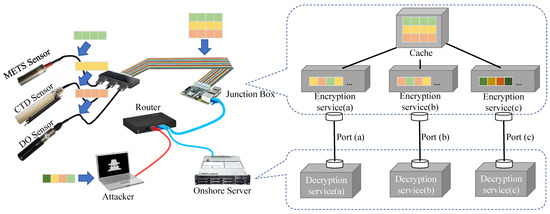 After undergoing processing by the heterogeneous encryption unit, the original data packet is partitioned into the following three distinct packets: , , and , which are then transmitted through the cable to the onshore data center or surface station. The integration of redundant shift operations effectively hinders attackers from deducing the original data values even if they intercept the transmission and possess prior knowledge of the collection process. This significantly raises the difficulty level for attackers attempting to steal authentic sensing data.