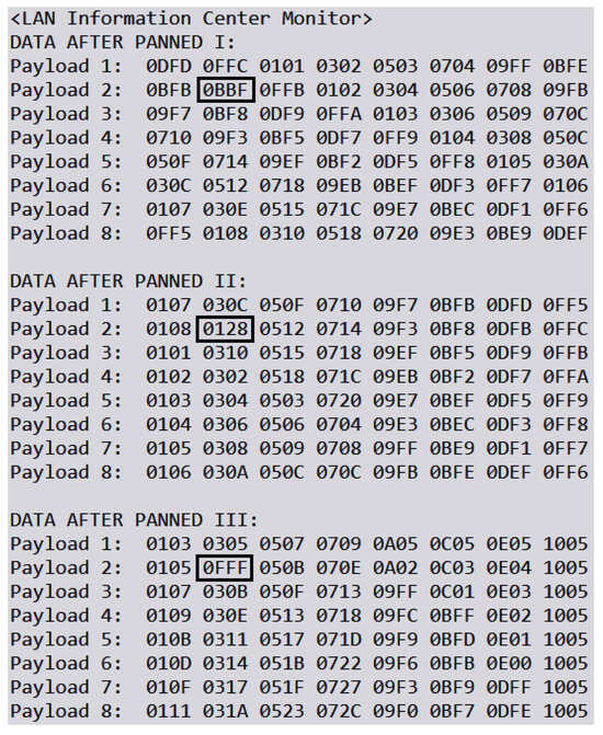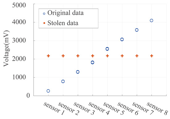 In this scenario, attackers listen to the data information transmitted in the LAN and analyze the collected information to obtain real data. As the values at the data block are changed over time, for example, at time , the value at the position of the i-th data block of the j-th sensor is , and at time , the value at that position is . This prevents attackers from obtaining the genuine sensor data by relying solely on the absolute packet positions. On the other hand, at different times, the distance between the real data reflected by and is different, which hinders attackers from extracting sensitive information using relative packet positions.