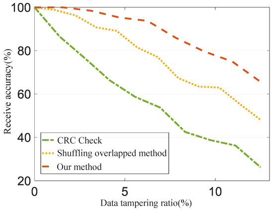Receive Accuracy: To evaluate the effectiveness of our proposed defense mechanism against data tampering attacks, we deliberately alter varying numbers of data blocks within each packet. The receive accuracy metric quantifies the proportion of data blocks received correctly. A higher receive accuracy implies a stronger defense against tampering.