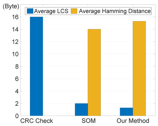 To analyze system’s efficacy against data stealing, we evaluate the average discrepancy between stolen data and its real value. We use Hamming distance and longest common subsequence (LCS) distance as measurement metrics. A greater Hamming distance signifies a larger dissimilarity between stolen and origin data, while a smaller LCS distance implies that attackers can obtain less information through stealing [36]. The experimental results displayed in Figure 15 reveal that with the CRC-16 check method, the LCS distance between the encrypted and original data is 16, while the minimum Hamming distance is 0. In contrast, our data encryption security scheme yields an average LCS distance of 1.3 and an average minimum Hamming distance of 15.3. These results surpass those of the SOM method, indicating that the ciphertext generated by our encryption module exhibits sufficient heterogeneity.