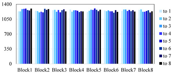 - Horizontal strategy. For the data packet , we shuffle the columns of the data blocks using encryption parameters while keeping the rows of each data block. This forms an encrypted data packet , where data block will be translated to the position , where and satisfy the following conditions:where a a is a natural number constant. When sets a, the data packet after horizontal translation is shown in Figure 8;