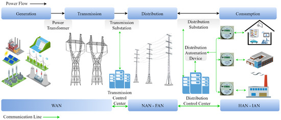 Understanding the data flow in smart grid applications is significant, and this can be achieved by examining their general structure. The overall structure of the smart grid environment is shown in Figure 1. Energy generated from diverse sources is transmitted over long distances through transmission lines and distributed to consumers via distribution lines. Data transmission is provided through AMI in the context of the energy infrastructure. While the Wide Area Network (WAN) is used in generation and transmission domains, the Neighborhood Area Network (NAN) and Field Area Network (FAN) are used in the distribution domain. Lastly, the Home Area Network (HAN) and Industrial Area Network (IAN) are used in the consumption domain.