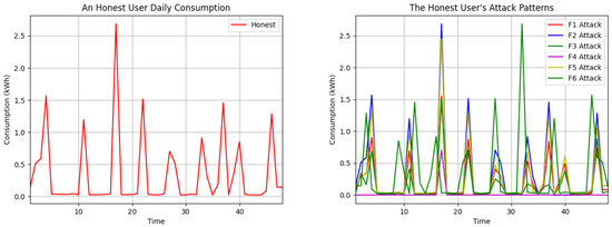 The attack multiplies all consumption readings by the same randomly chosen value . The attack assigns zero to certain time interval readings of the day, and the others remain the same actual value. We chose the time period between 38 and 43 due to the peak electricity consumption during the evening hours. The attack multiplies each meter reading by a distinct random value . The attack generates a random number between 0.1 and the max consumption value of each user. It subtracts this result from each reading for that customer. If the result value is negative, it is set to 0; if it is positive, the difference is written. The attack subtracts the mean of all consumption data of each consumer from each reading. If the result is greater than or equal to 0, the difference is written; otherwise, the consumption data remain the same. The attack reverses the order of each customer’s readings daily. Although the total consumption remains constant, the reporting of intensive usage is shifted to low-tariff periods. The impact of the six attack vectors on the daily use of an honest customer is shown in Figure 2.