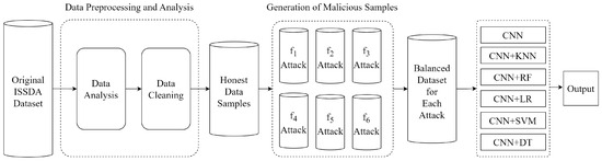 Figure 4 shows the NTL flowchart of the proposed model for each attack vector. Firstly, the dataset obtained from ISSDA was subjected to preprocessing by performing data analysis and cleaning. The obtained honest samples were exposed to each f attack vector separately, and six balanced datasets were obtained. Five CNN-based ML models and a pure CNN model were employed to classify users as honest or malicious. Each CNN-based model was trained and tested on these balanced datasets. Finally, the performance of the models was compared.