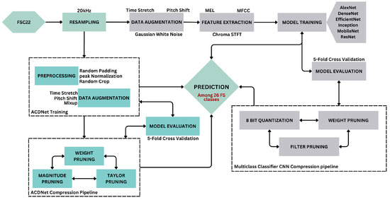 The primary objective of this study is to determine the optimal combination of DL techniques and identify the best-performing forest sound classification model suitable for deployment on an edge device. The experiments are conducted on the FSC22 dataset, employing diverse combinations of data augmentation techniques, feature extraction methods, models, and model compression approaches. This experimental workflow encompasses two principal pipelines, one dedicated to the six selected CNN architectures and the other for the ACDNet model. A flowchart depicting the overall workflow of the experiment is shown in Figure 2.