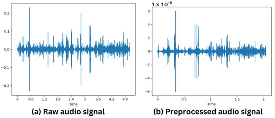The initial stage of the pipeline involved the application of data preprocessing techniques to the resampled data in the ACDNet pipeline, as shown by the green color processes in Figure 2. We standardized the input data array length, ensuring equal importance. This standardization is achieved through preprocessing methods such as padding or random cropping, contingent upon the length of the datum. Additionally, amplitude normalization, according to Equation (12), based on the 16-bit float representation of the audio signal, is applied to normalize the data. The effect of amplitude normalization can be observed by comparing Figure 3a,b as the y-axis scale is drastically different, but the waveform remains unchanged. Furthermore, the pipeline incorporates experimentation with three augmentation techniques: time stretch, pitch shift, and mix-up. These augmentation methods are implemented to enhance the robustness and diversity of the training dataset for improved model performance.