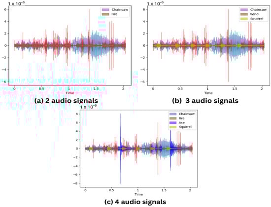 Subsequently, a mix-up is applied to create miniature batches for each epoch, dynamically augmenting the dataset. In the context of the baseline ACDNet [40], mix-up refers to the mixing up of randomly selected two audio samples from different classes in a random ratio together to create a new synthesized audio sample as depicted in Figure 4a. However, in this experimentation, variations are introduced by exploring the mix-up of 3 audio clips and 4 audio clips as depicted in Figure 4b,c, respectively, providing a comparative analysis of different mix-up configurations.