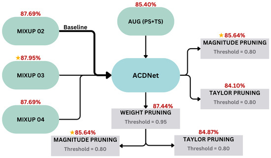 In the process of compression, the baseline ACDNet was subjected to weight pruning as the first step, and with a pruning ratio of 0.95, an accuracy of 87.44% was obtained. This was followed by a different approach to structural pruning methods, namely magnitude pruning, Taylor pruning, hybrid-magnitude pruning, and hybrid Taylor pruning. Table 2 shows the performance of ACDNet with each pruning approach, and the highest pruned accuracy, 85.64%, was obtained for both magnitude pruning and hybrid-magnitude pruning. Figure 5 shows the complete comparison of the experiments conducted on ACDNet along with the results obtained.