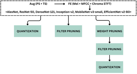The proposed pipeline, encompassing data augmentation, feature extraction, model training, model evaluation, and model compression, as shown using the gray color processes in Figure 2, can be abstractly represented by Algorithm 1.