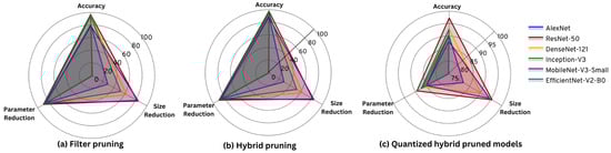 Yuzhong Wu et al. [51] introduced a methodology for audio classification model size reduction using low-dimensional feature representation of audio segments. This study has obtained a size reduction of 4.55% and 11.11%, respectively, on AlexNet and ResNet-50, along with an accuracy of 85.9% and 91.4%. The study by Ma et al. [66], which investigated a structured pruning approach with network purification and unused path removal, could achieve accuracies of 81.76% and 92.26% on AlexNet and ResNet-50 trained on ImageNet, respectively. AlexNet and ResNet-50 trained on FSC22 when subjected to weight and filter pruning followed by quantization achieved an accuracy of 90.21% and 97.28%. Moreover, Molchanov et al. [49] presented a Taylor criteria-based pruning approach to pruning CNNs. This study has evaluated the performance of the AlexNet on the dataset Flowers-102 with Taylor pruning and obtained an accuracy of 80.1%.
